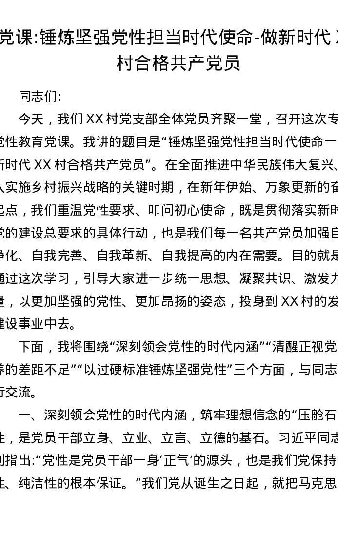 党课讲稿:锤炼坚强党性担当时代使命-做新时代XX村合格共产党员