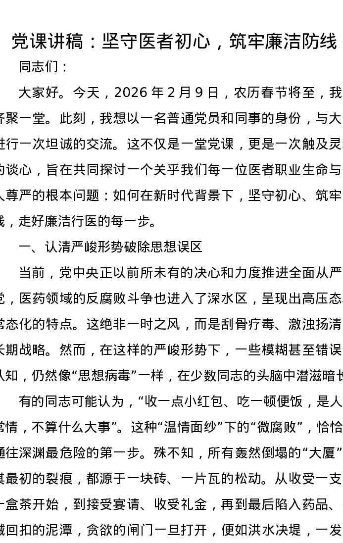 党课讲稿:坚守医者初心,筑牢廉洁防线