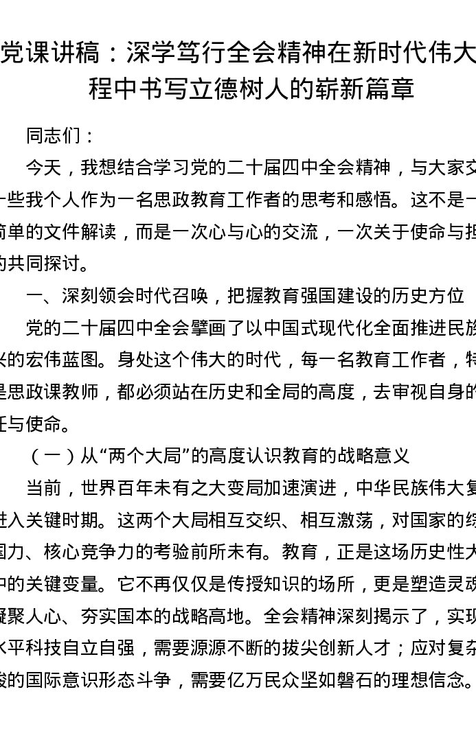 党课讲稿:深学笃行全会精神 在新时代伟大征程中书写立德树人的崭新篇章