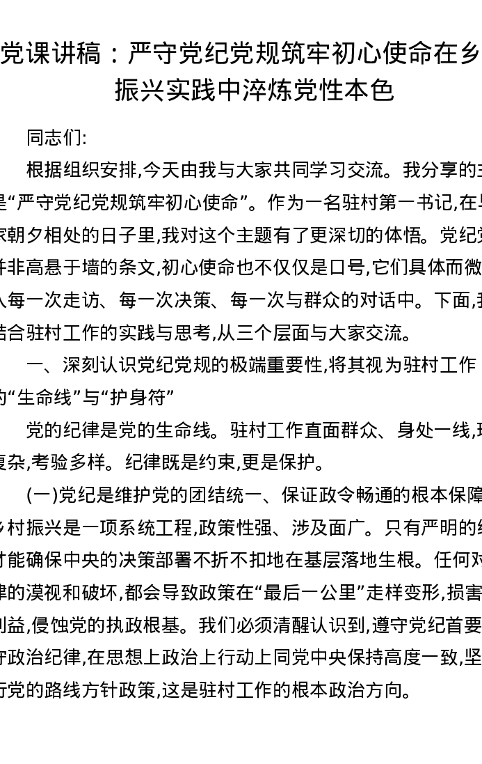 党课讲稿:严守党纪党规筑牢初心使命 在乡村振兴实践中淬炼党性本色