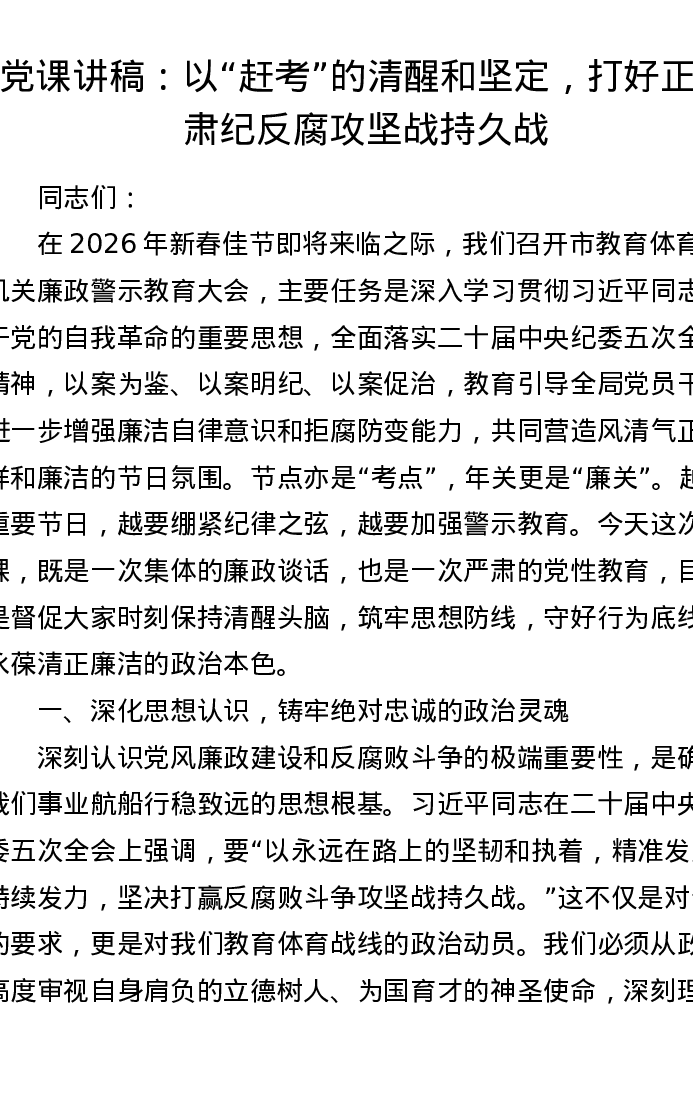 党课讲稿:以赶考的清醒和坚定,打好正风肃纪反腐攻坚战持久战