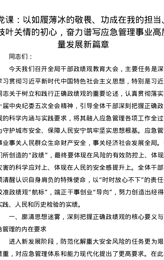 党课讲稿:以如履薄冰的敬畏、功成在我的担当、枝叶关情的初心,奋力谱写应急管理事业高质量发展新篇章