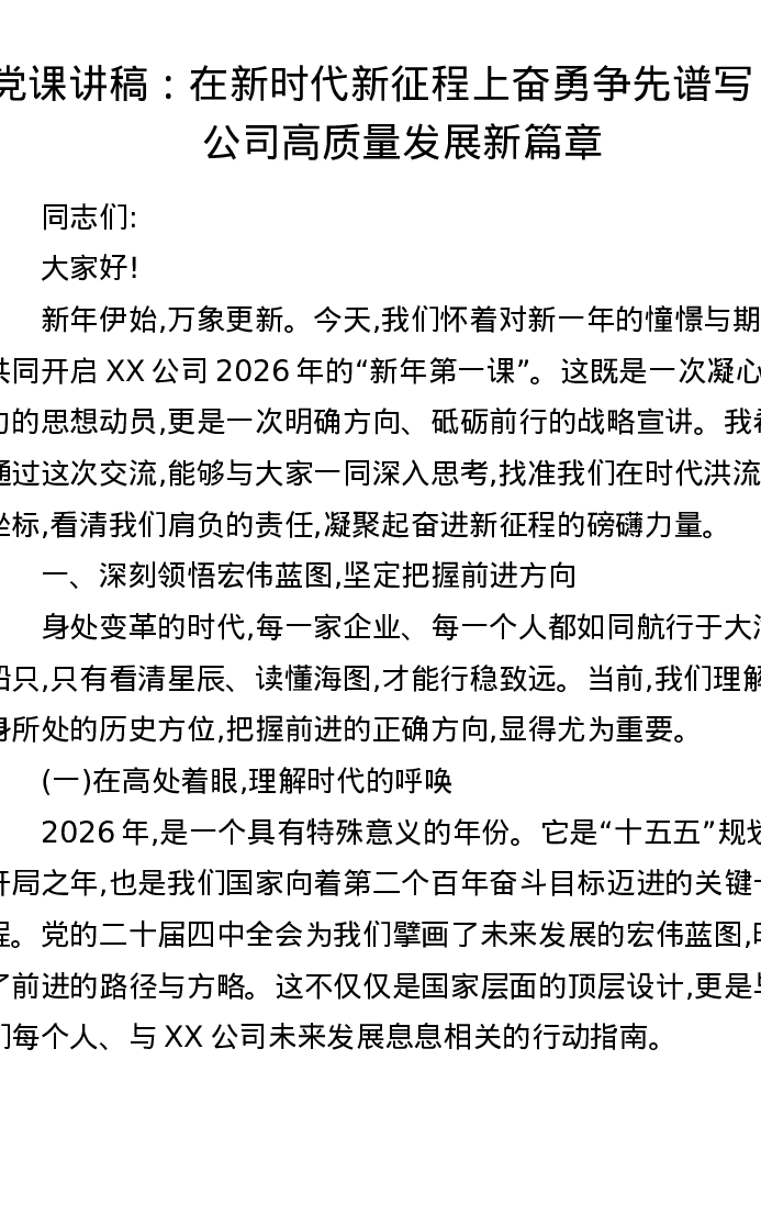 党课讲稿:在新时代新征程上奋勇争先谱写XX公司高质量发展新篇章
