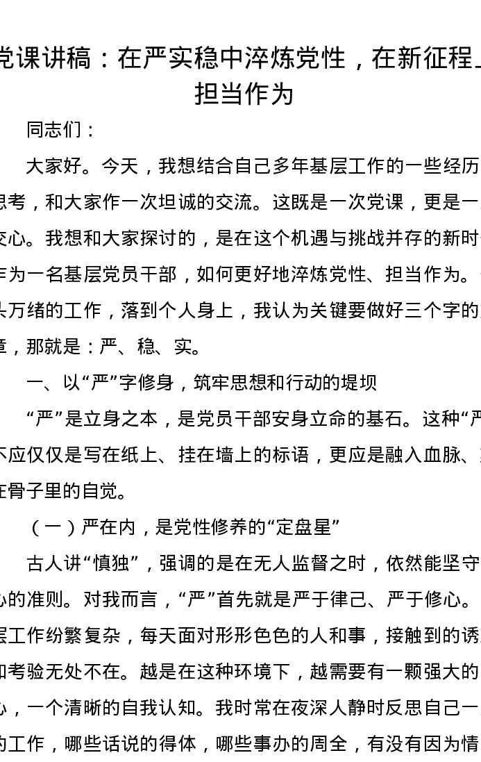 党课讲稿:在严实稳中淬炼党性,在新征程上担当作为