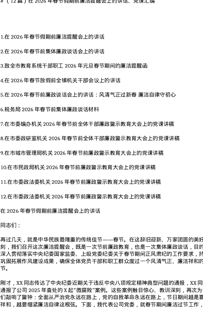 汇编:在2026年春节假期前廉洁提醒会上的讲话、党课12篇