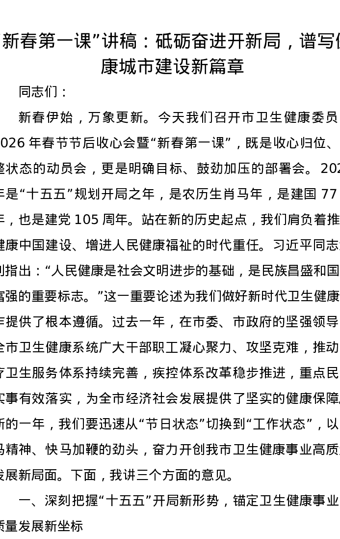新春第一课讲稿:砥砺奋进开新局,谱写健康城市建设新篇章