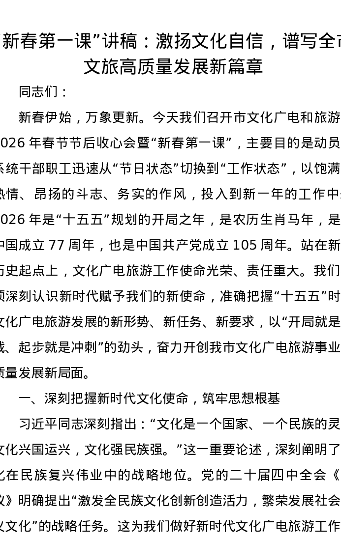 新春第一课讲稿:激扬文化自信,谱写全市文旅高质量发展新篇章