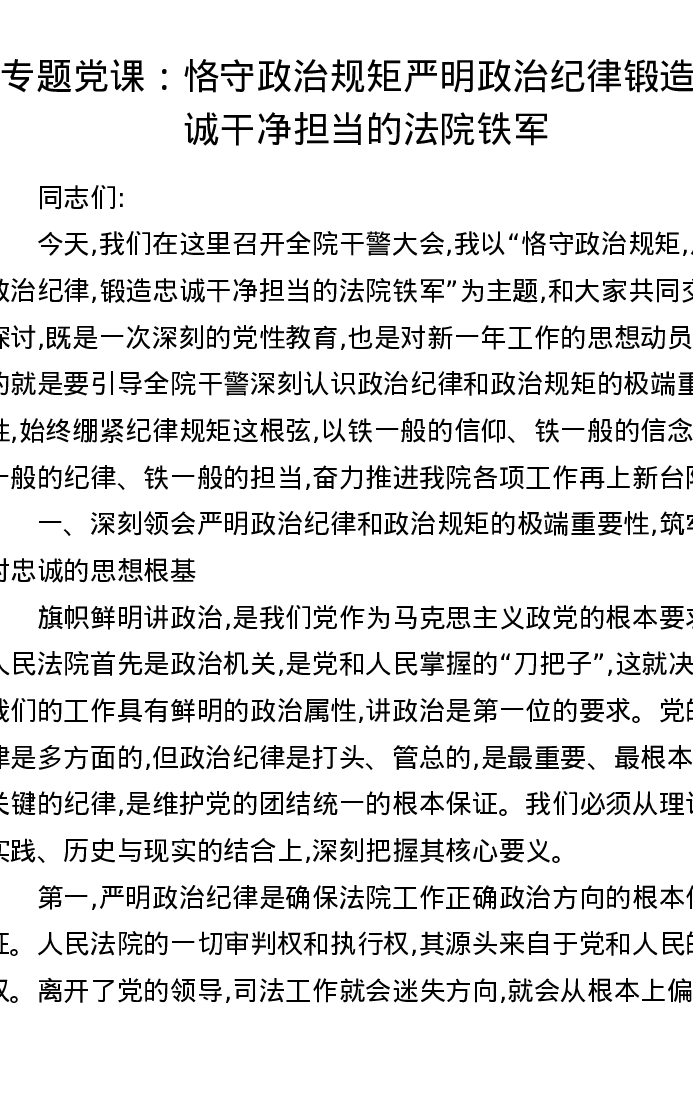 专题党课:恪守政治规矩 严明政治纪律 锻造忠诚干净担当的法院铁军