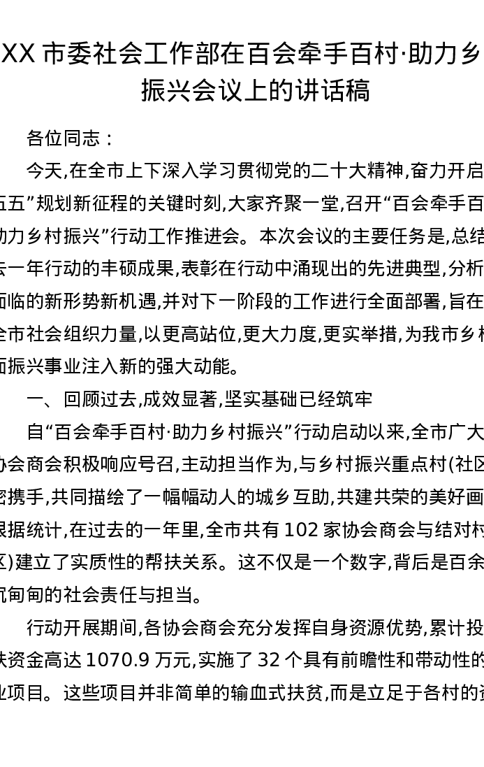 XX市委社会工作部在百会牵手百村·助力乡村振兴会议上的讲话稿