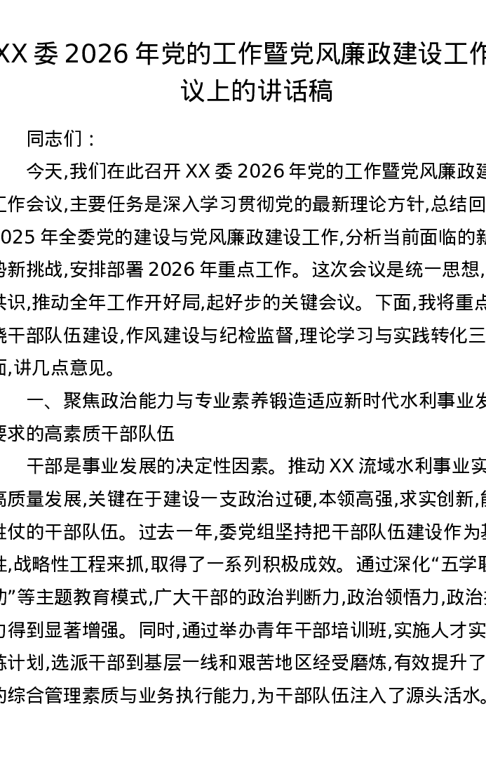 XX委2026年党的工作暨党风廉政建设工作会议上的讲话稿