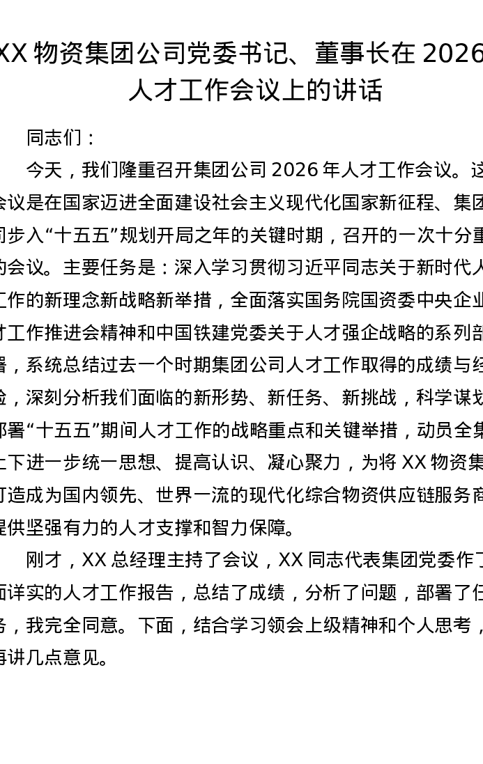 XX物资集团公司党委书记、董事长在2026年人才工作会议上的讲话