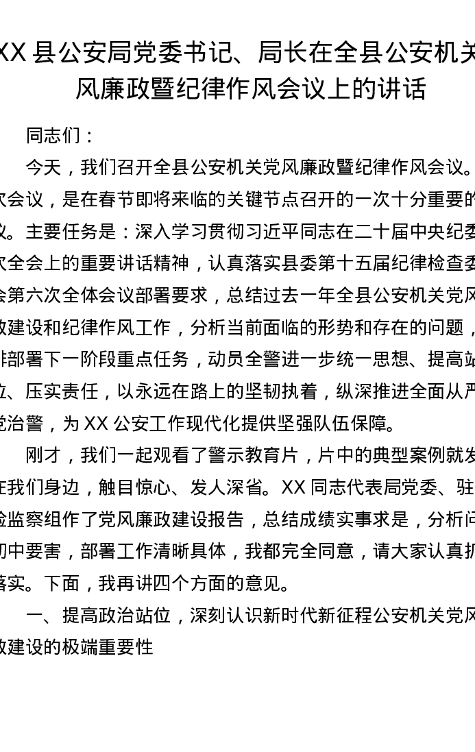 XX县公安局党委书记、局长在全县公安机关党风廉政暨纪律作风会议上的讲话