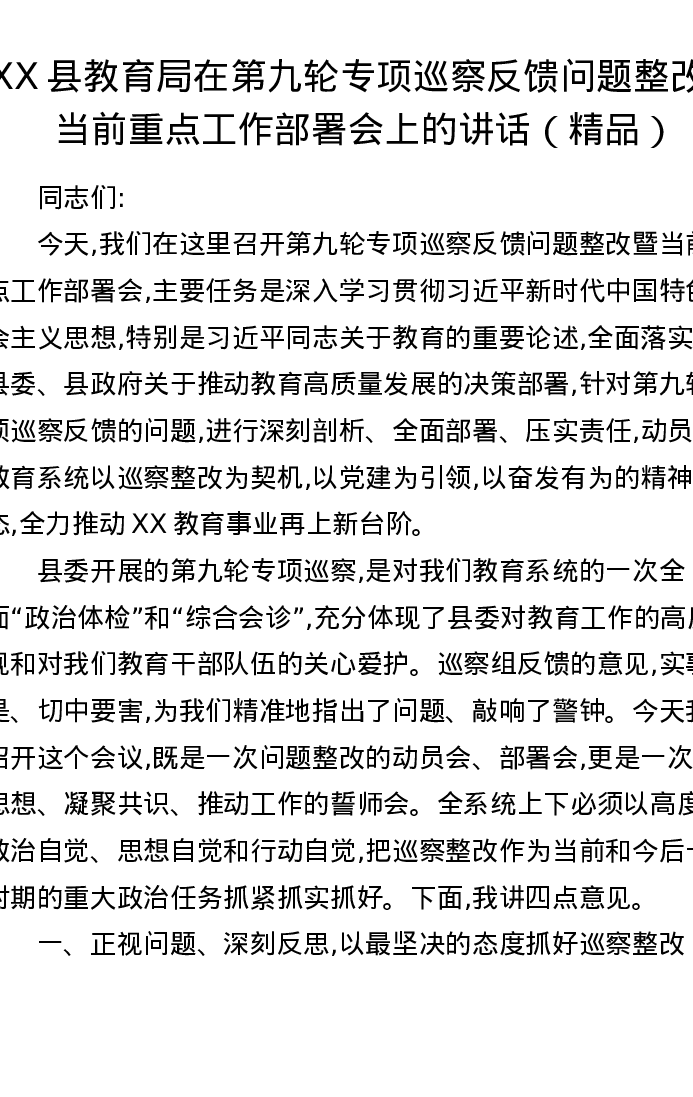 XX县教育局在第九轮专项巡察反馈问题整改及当前重点工作部署会上的讲话