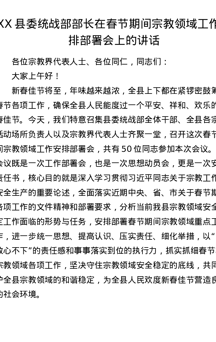 XX县委统战部部长在春节期间宗教领域工作安排部署会上的讲话