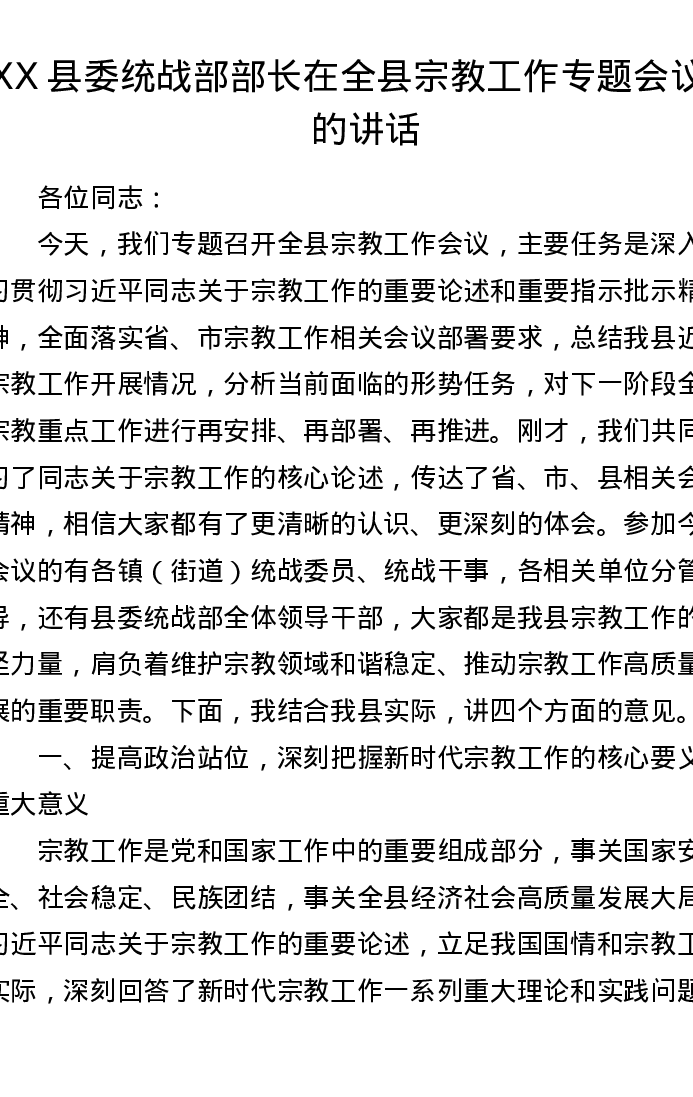 XX县委统战部部长在全县宗教工作专题会议上的讲话