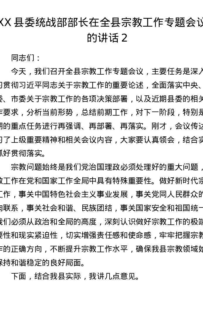 XX县委统战部部长在全县宗教工作专题会议上的讲话2