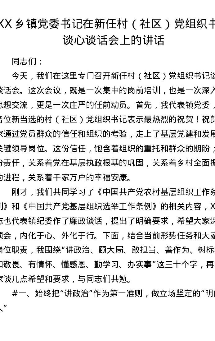 XX乡镇党委书记在新任村(社区)党组织书记谈心谈话会上的讲话(5236字)