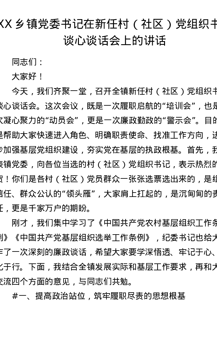 XX乡镇党委书记在新任村(社区)党组织书记谈心谈话会上的讲话(5339字)