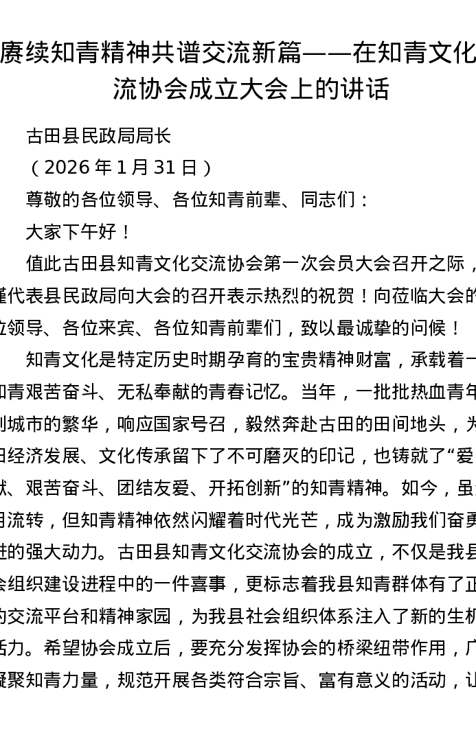 赓续知青精神 共谱交流新篇——在知青文化交流协会成立大会上的讲话