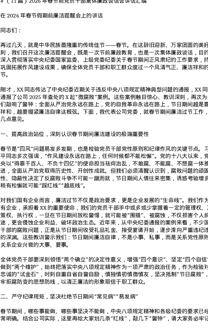 汇编:2026年春节前党员干部集体廉政谈话会讲话11篇