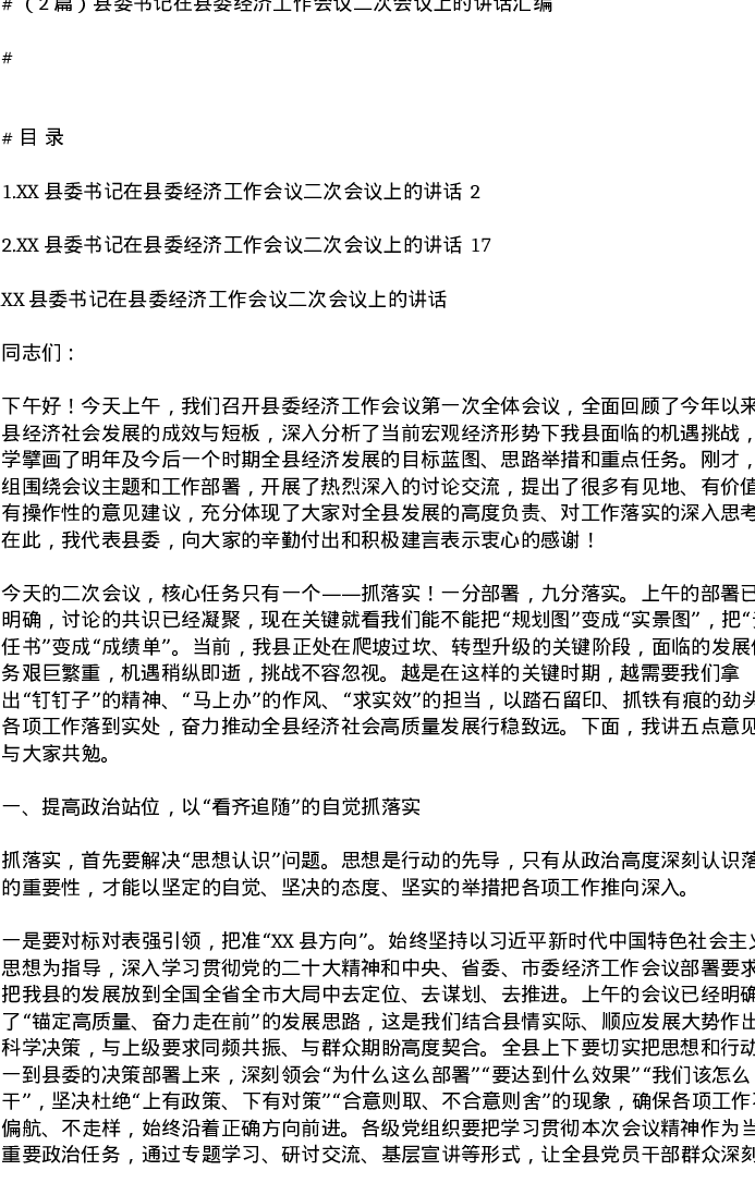 汇编:县委书记在县委经济工作会议二次会议上的讲话2篇