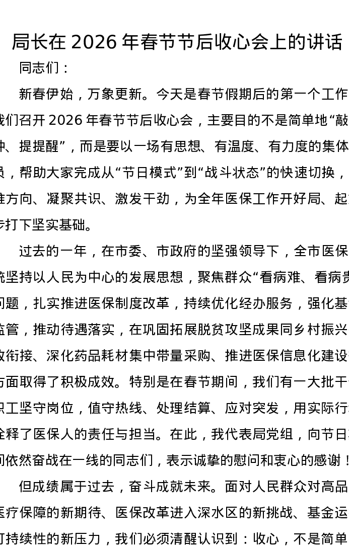 局长在2026年春节节后收心会上的讲话
