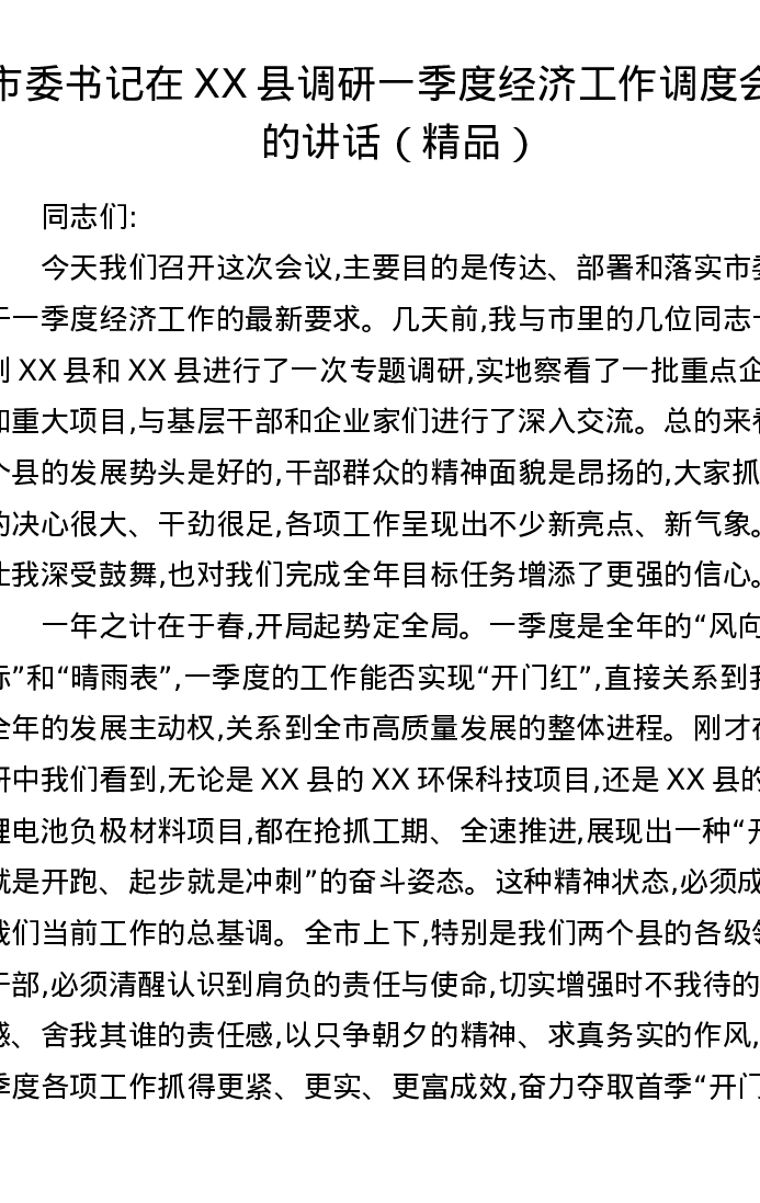 市委书记在XX县调研一季度经济工作调度会上的讲话