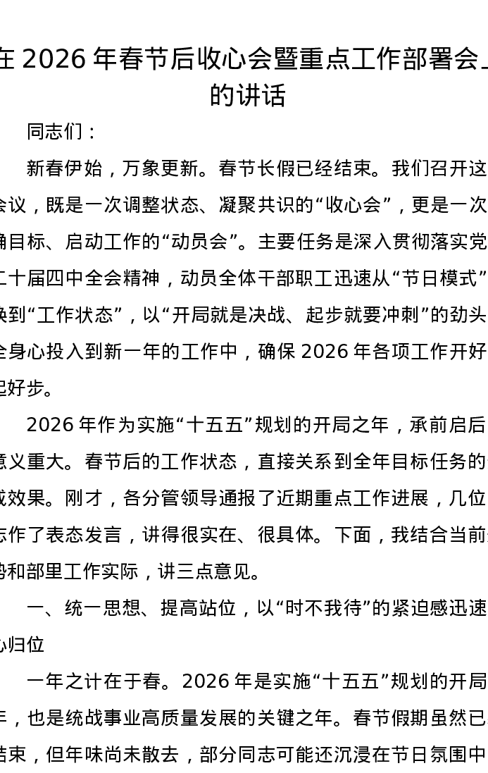 在2026年春节后收心会暨重点工作部署会上的讲话