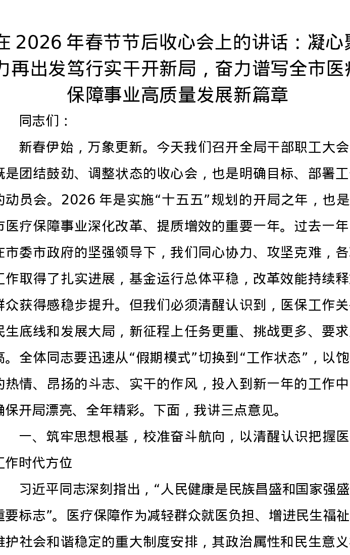 在2026年春节节后收心会上的讲话:凝心聚力再出发笃行实干开新局,奋力谱写全市医疗保障事业高质量发展新篇章