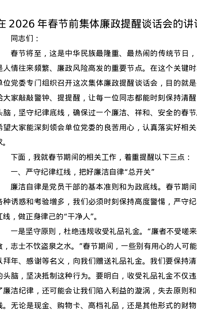 在2026年春节前集体廉政提醒谈话会的讲话