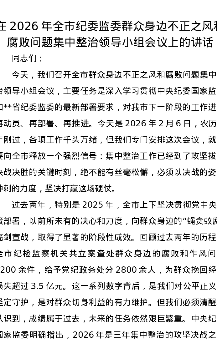 在2026年全市纪委监委群众身边不正之风和腐败问题集中整治领导小组会议上的讲话