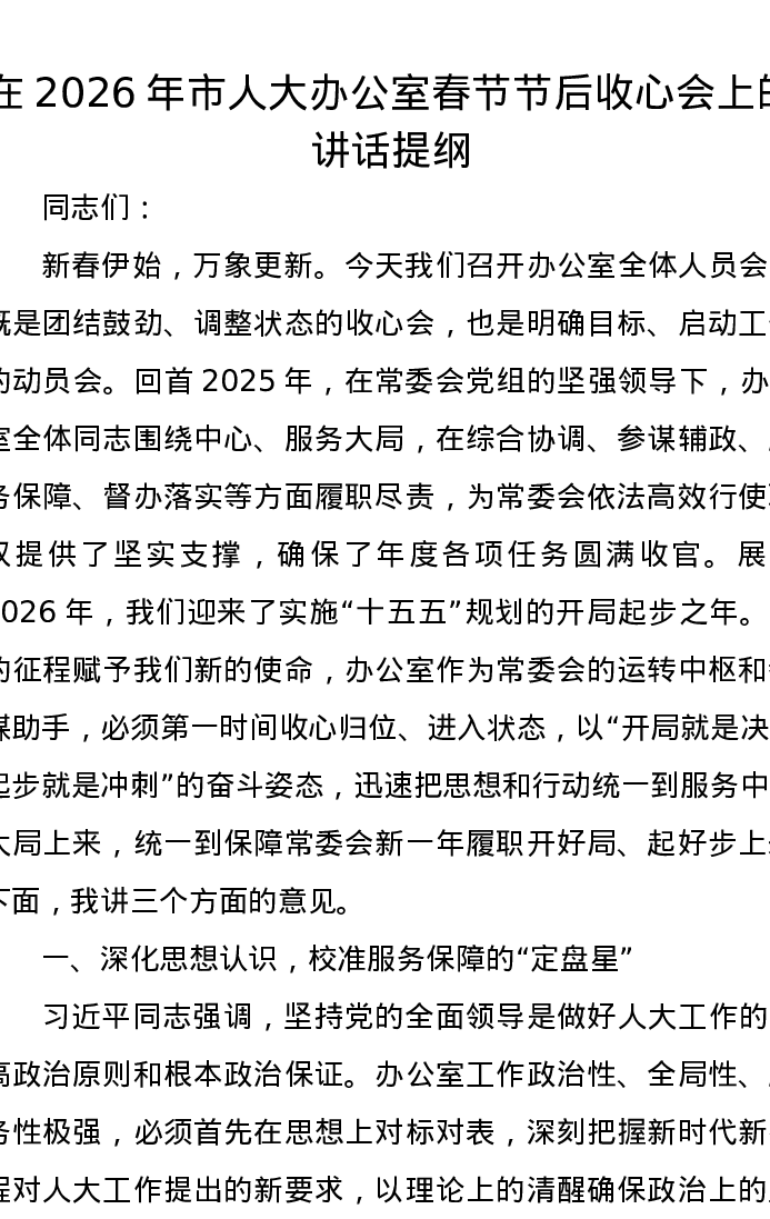 在2026年市人大办公室春节节后收心会上的讲话提纲