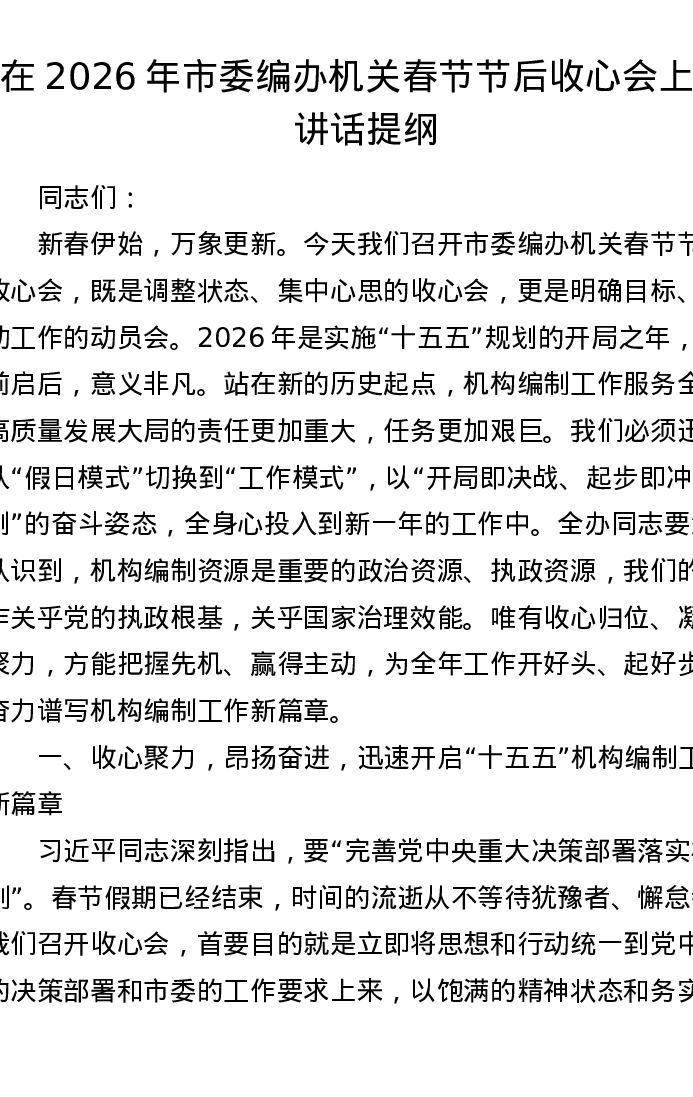 在2026年市委编办机关春节节后收心会上的讲话提纲