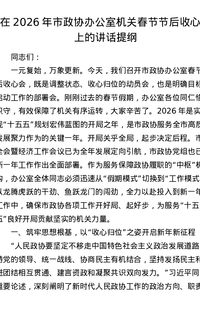 在2026年市政协办公室机关春节节后收心会上的讲话提纲