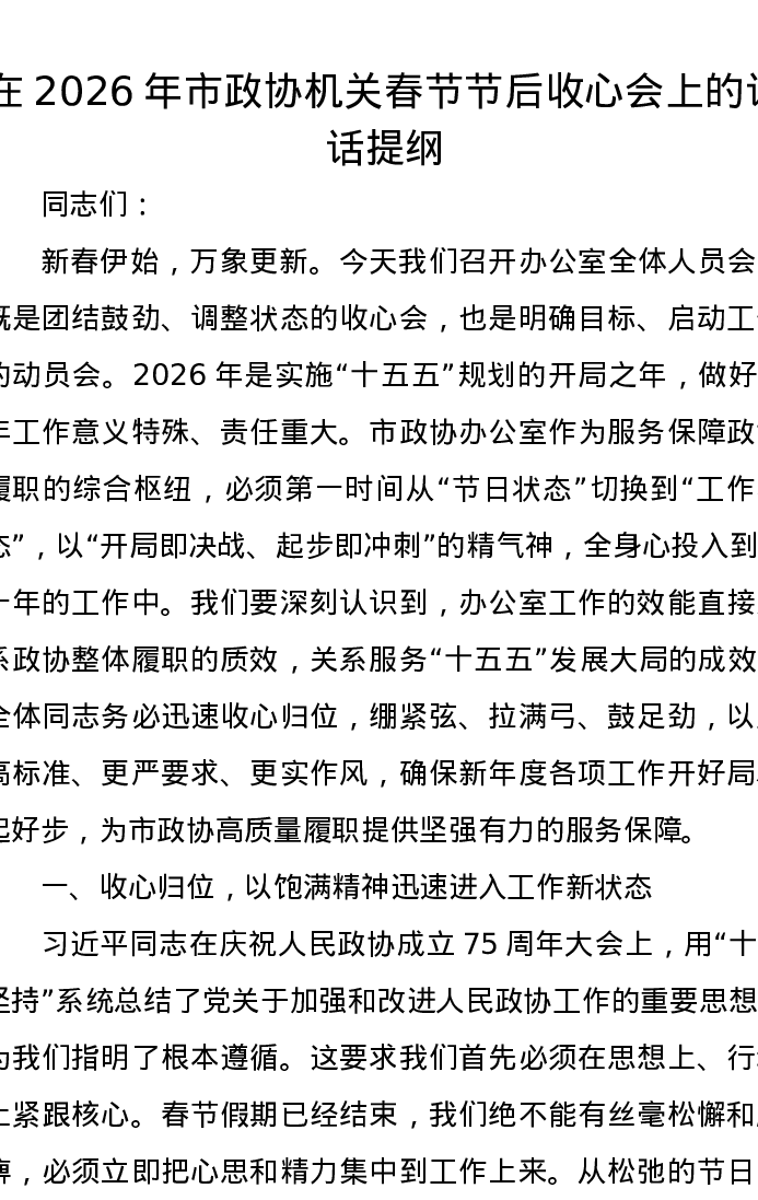 在2026年市政协机关春节节后收心会上的讲话提纲