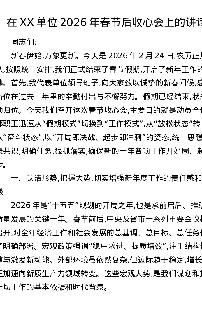在XX单位2026年春节后收心会上的讲话