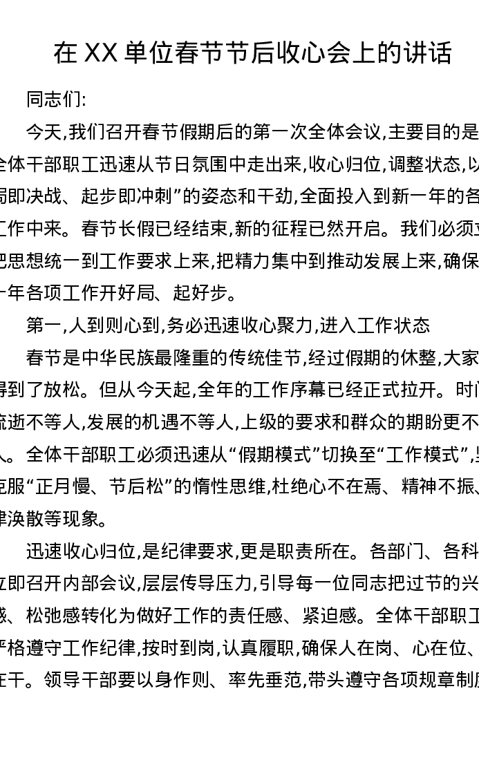 在XX单位春节节后收心会上的讲话