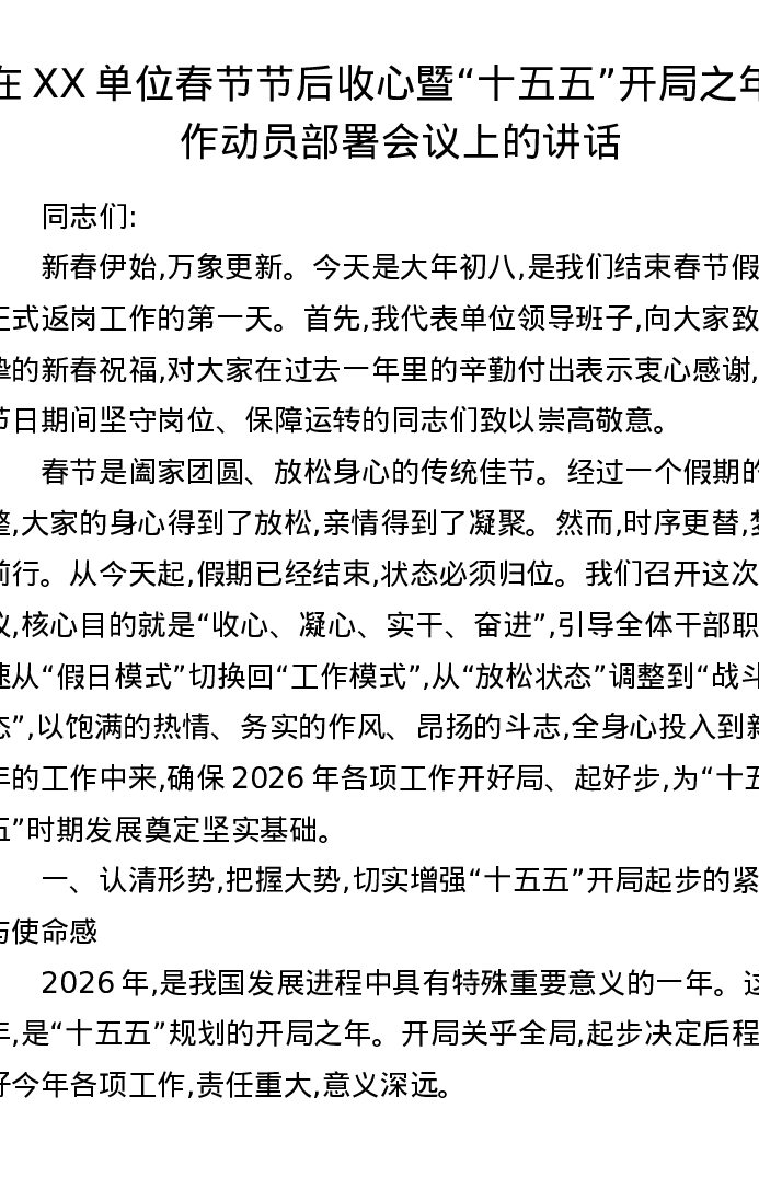 在XX单位春节节后收心暨十五五开局之年工作动员部署会议上的讲话