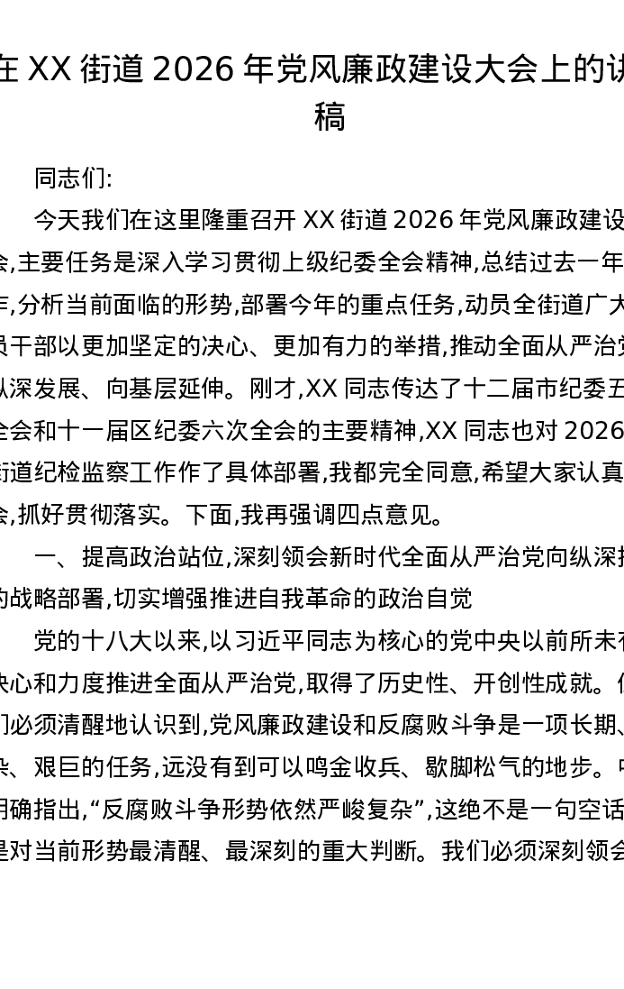 在XX街道2026年党风廉政建设大会上的讲话稿