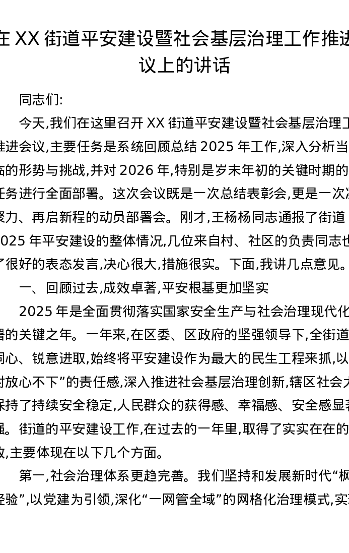 在XX街道平安建设暨社会基层治理工作推进会议上的讲话