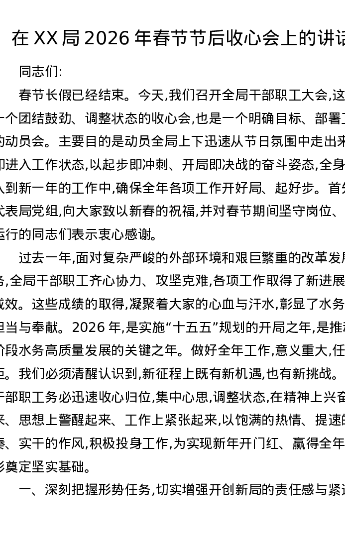 在XX局2026年春节节后收心会上的讲话