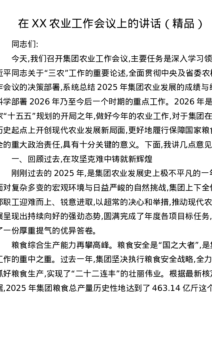 在XX农业工作会议上的讲话