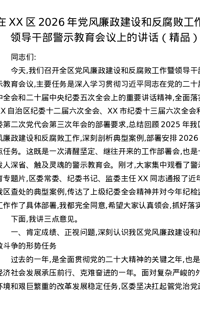 在XX区2026年党风廉政建设和反腐败工作暨领导干部警示教育会议上的讲话
