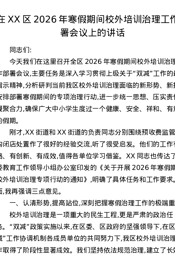 在XX区2026年寒假期间校外培训治理工作部署会议上的讲话