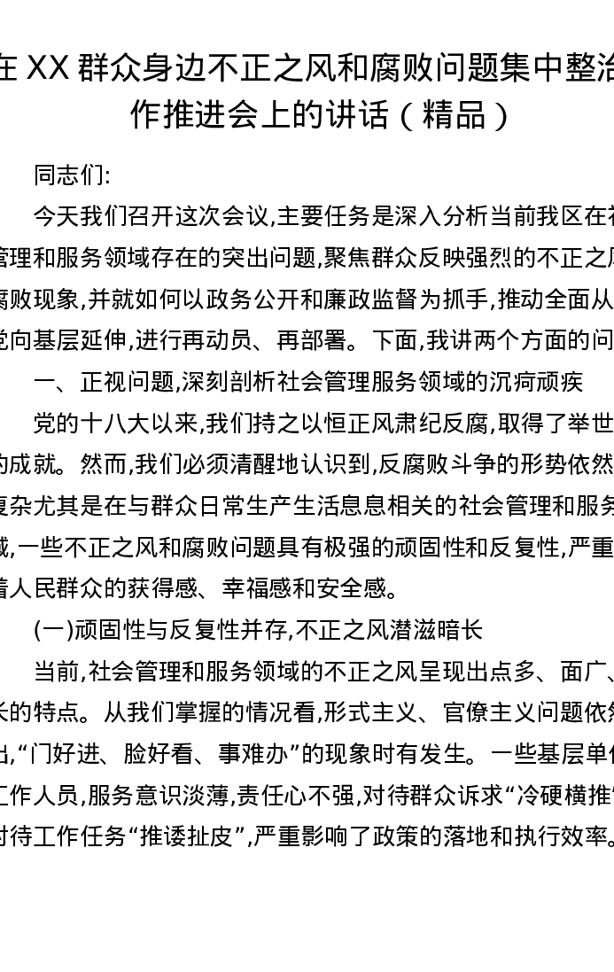 在XX群众身边不正之风和腐败问题集中整治工作推进会上的讲话