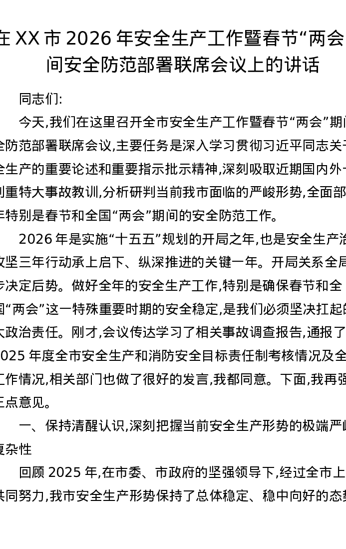 在XX市2026年安全生产工作暨春节两会期间安全防范部署联席会议上的讲话