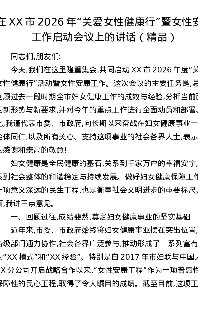 在XX市2026年关爱女性健康行暨女性安康工作启动会议上的讲话