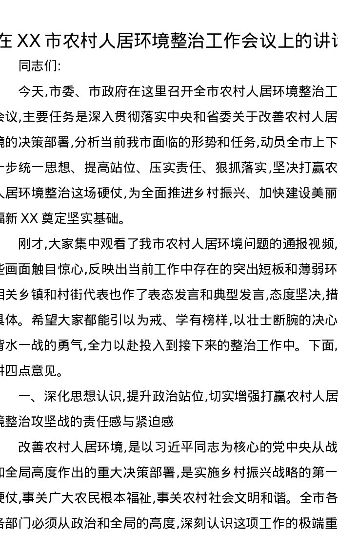 在XX市农村人居环境整治工作会议上的讲话