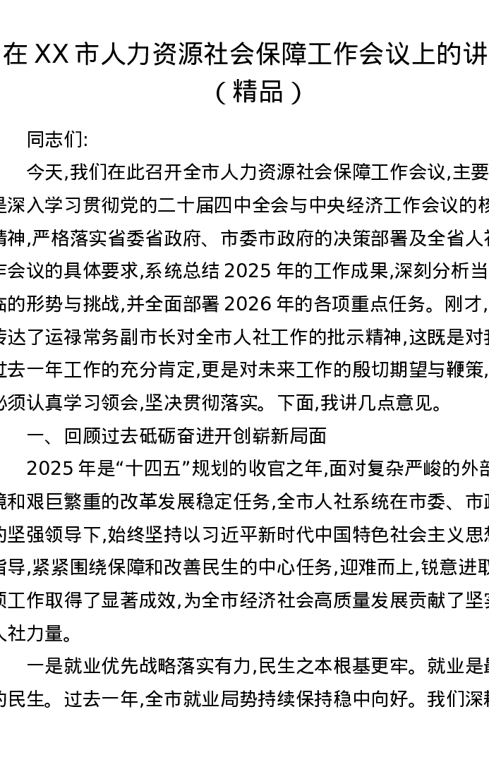 在XX市人力资源社会保障工作会议上的讲话