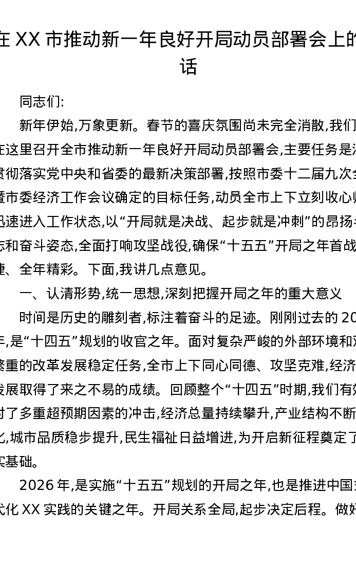 在XX市推动新一年良好开局动员部署会上的讲话